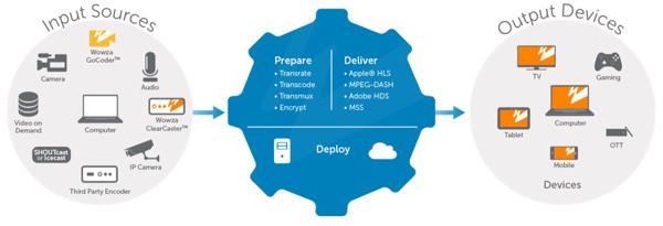 The product of Wowza Media Systems, which we handle, is one of the streaming platforms shown above. It supports various input formats, performs dynamic packaging of MPEG-DASH and HLS streams from the inputs for your video streaming over the Internet.